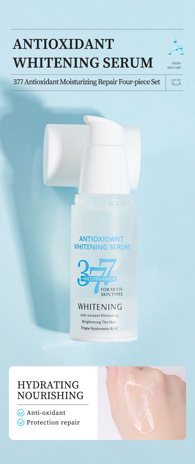 1、極致透白精華液:采用最新科技配方,富含多種美白成分,深入肌膚底層,抑制黑色素生成,提亮膚色,其質(zhì)地輕盈,容易被肌膚吸收,讓你的肌膚在短時間內(nèi)煥發(fā)出白皙光澤。