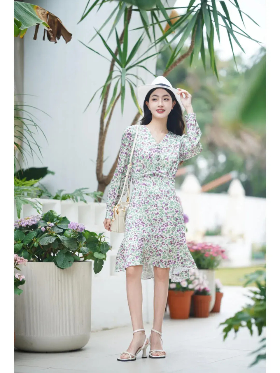 3、碎花裙+高跟鞋:想要展現(xiàn)優(yōu)雅氣質(zhì),高跟鞋是不可或缺的搭配單品。